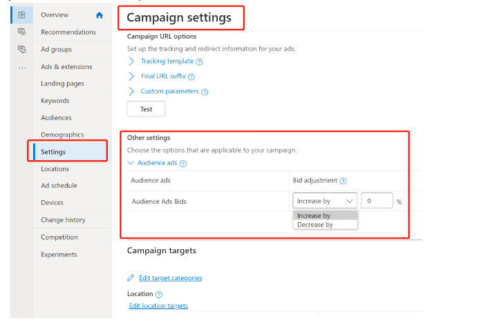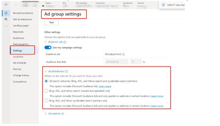 - 找到展示网络(Microsoft Audience Ads)的投放设置。