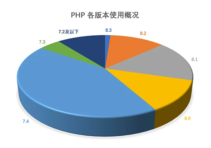 PHP 各版本使用概况(截止至2024年4月)PHP 8.3: 1.20%PHP 8.2: 12.07%PHP 8.1: 16.34%PHP 8.0: 12.25%PHP 7.4: 42.80%其他版本分布于 3.80% 至 1.50% 之间立即行动,升级 PHP