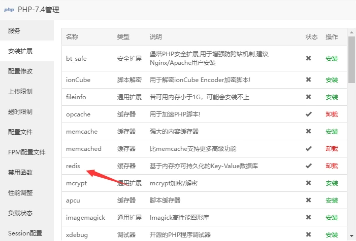 2.找到PHP版本,并且安装redis 扩展。