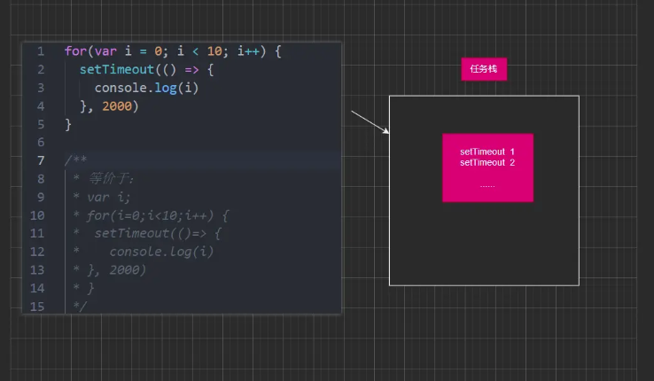 并且这里setTimeout不会被立即执行,它们会加入一个任务栈当中。同时,for循环是一个同步,而setTimeout是一个异步,异步方法要等到同步方法执行完之后才会开始执行,就导致了i的值已经变成了9的时候,setTimeout都还没有开始执行,这就会导致10个setTimeout中console.log都输出9。