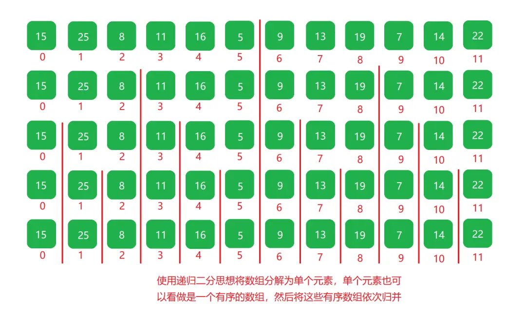 可以使用递归二分的思想把一个无序的数组分解为多个单元素的数组(单元素数组也可以看做有序数组)