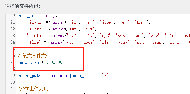 在upload_json.php文件找到最大文件大小参数,如下图,把它改成自己限制的最大尺寸。它的单位为B。