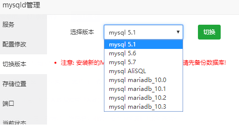 下图服务器使用的MySQL5.5版本,所以在切换版本里没有显示5.5