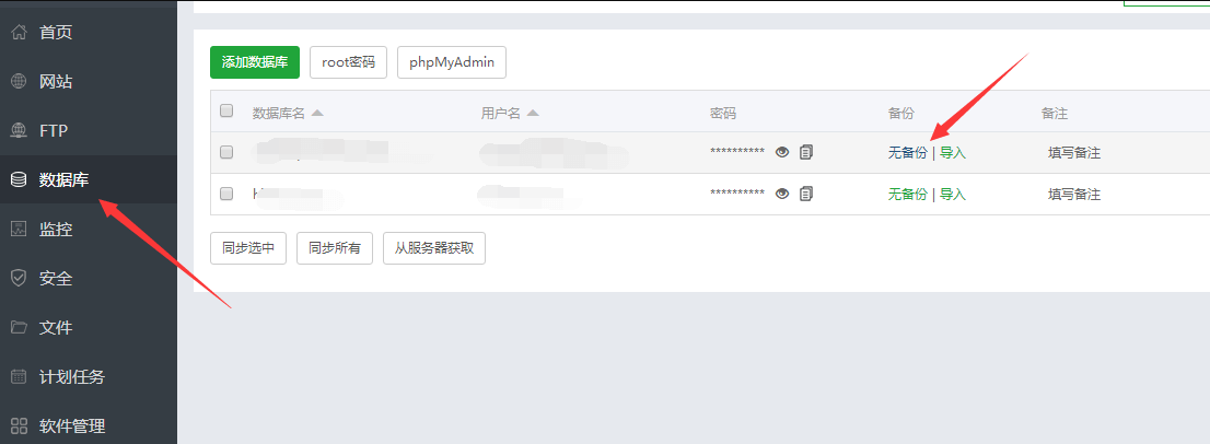 宝塔面板的数据库备份非常简单,我们可以直接在面板上进行备份,也可以进入phpmyadmin进行备份(下面会讲到)。
