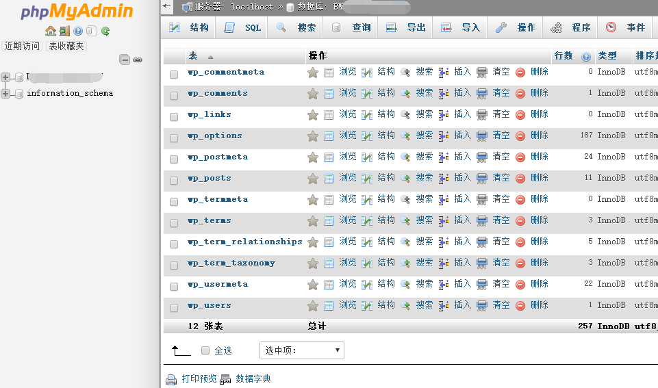 数据库的管理默认是通过phpmyadmin这个程序来管理的,我们点击数据库后面的管理就跳转到了phpmyadmin的界面。如果打不开的话,参考这篇文章:宝塔面板phpmyadmin打不开
