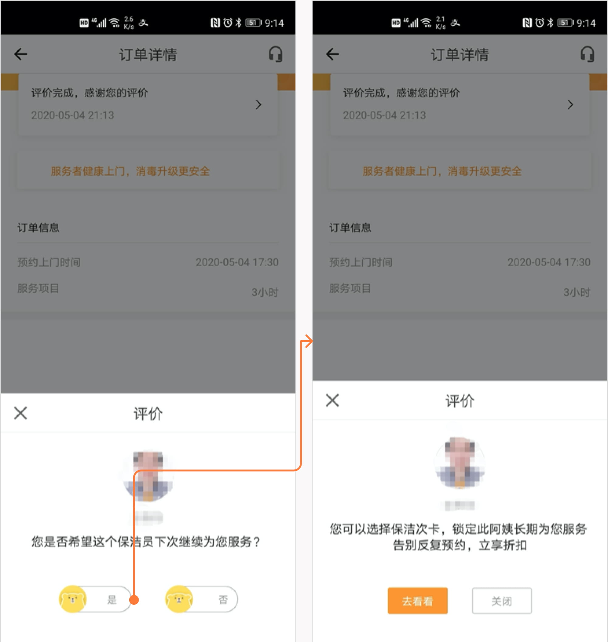 当你给保洁大姐打出五星好评的那一刻,是不是心里满满的都是满意和感激?就在这时,自如贴心地询问你是否需要保洁的次卡服务,让你在心情最好的时候,轻松考虑长期的服务计划。 这种在用户最高兴的时刻推荐长期服务...