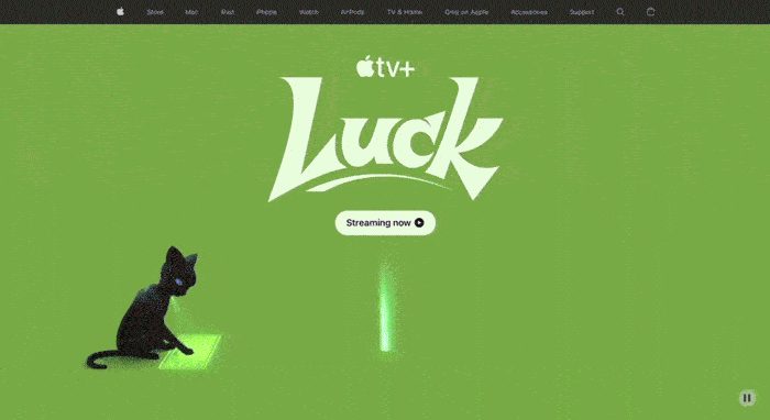 「苹果TV」投资拍摄的首部长篇动画电影《Luck》上映,讲述了一个女孩与她的黑猫的故事。为了宣传自家的影片,「苹果」特地将电影里的角色与场景和美国官网做了趣味性的互动结合,给网站带来惊喜、活力的同时,也巧妙做了推广。
